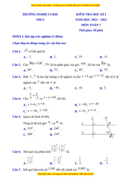 Đề thi cuối kì 1 Toán 7 Cánh diều trường Mariecurie