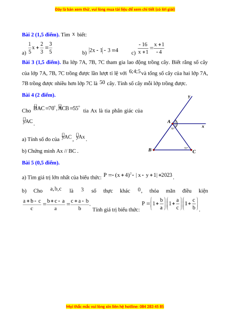 tia Ax là tia phân giác của . A x 70° a) Tính số đo của , . b) Chứng minh Ax // BC . 55° B C Bài 5 (0,5 điểm).