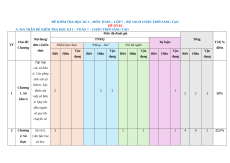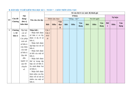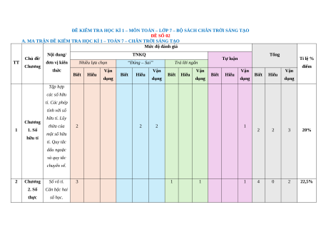 A. MA TRẬN ĐỀ KIỂM TRA HỌC KÌ 1 – TOÁN 7 – CHÂN TRỜI SÁNG TẠO Mức độ đánh giá Nội dung/ TNKQ Tổng Chủ đề/ Tự luận Tỉ lệ % TT đơn vị kiến Nhiều lựa chọn “Đúng – Sai” Trả lời ngắn Chương điểm thức Vận Vận Vận Vận Vận Biết Hiểu Biết Hiểu Biết Hiểu Biết Hiểu Biết Hiểu dụng dụng dụng dụng dụng Tập hợp các số hữu tỉ. Các phép tính với số hữu tỉ. Lũy Chương thừa của 2 2 2 1 1 1. Số 2 2 3 20% một số hữu hữu tỉ tỉ. Quy tắc dấu ngoặc và quy tắc chuyển vế. 2 Chương Số vô tỉ. 3 1 1 1 4 0 2 22,5% 2. Số Căn bậc hai thực số học. Số thực. Giá trị tuyệt đối của một số thực. Làm tròn số và ước lượng kết quả. 3 Chương Hình hộp 2 1 1 2 1 1 15% 3. Các chữ nhật – hình Hình lập khối phương. trong Diện tích