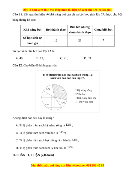 Câu 11. Kết quả tìm hiểu về khả năng bơi của tất cả các học sinh lớp 7A được cho bởi bẳng thống kê sau: Biết bơi nhưng Khả năng bơi Bơi thành thạo Chưa biết bơi chưa thành thạo Số học sinh tự 12 21 7 đánh giá
