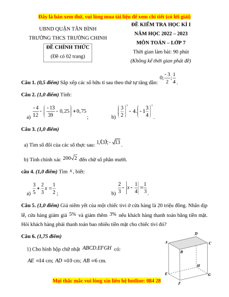 NĂM HỌC 2022 – 2023 TRƯỜNG THCS TRƯỜNG CHINH MÔN TOÁN – LỚP 7 ĐỀ CHÍNH THỨC
