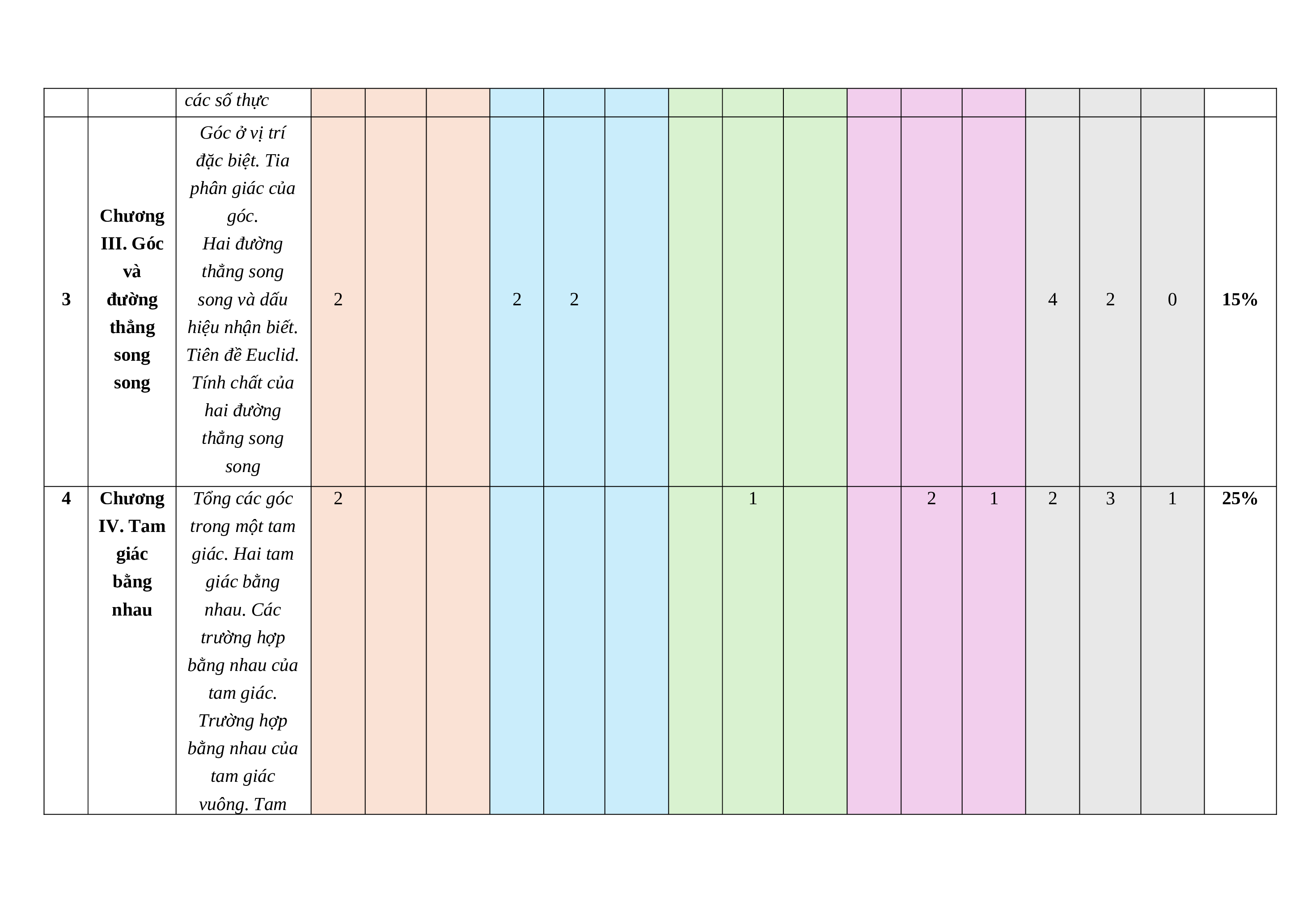 Chương Làm quen với 4 1 1 4 0 2 20% II. Số số thập phân thực vô hạn tuần hoàn. Số vô tỉ. Căn bậc hai số học. Tập hợp các số thực Góc ở vị trí đặc biệt. Tia phân giác của Chương góc. III. Góc Hai đường và thẳng song 3 đường song và dấu 2 2 2 4 2 0 15% thẳng hiệu nhận biết. song Tiên đề Euclid. song Tính chất của hai đường thẳng song song 4 Chương Tổng các góc 2 1 2 1 2 3 1 25%