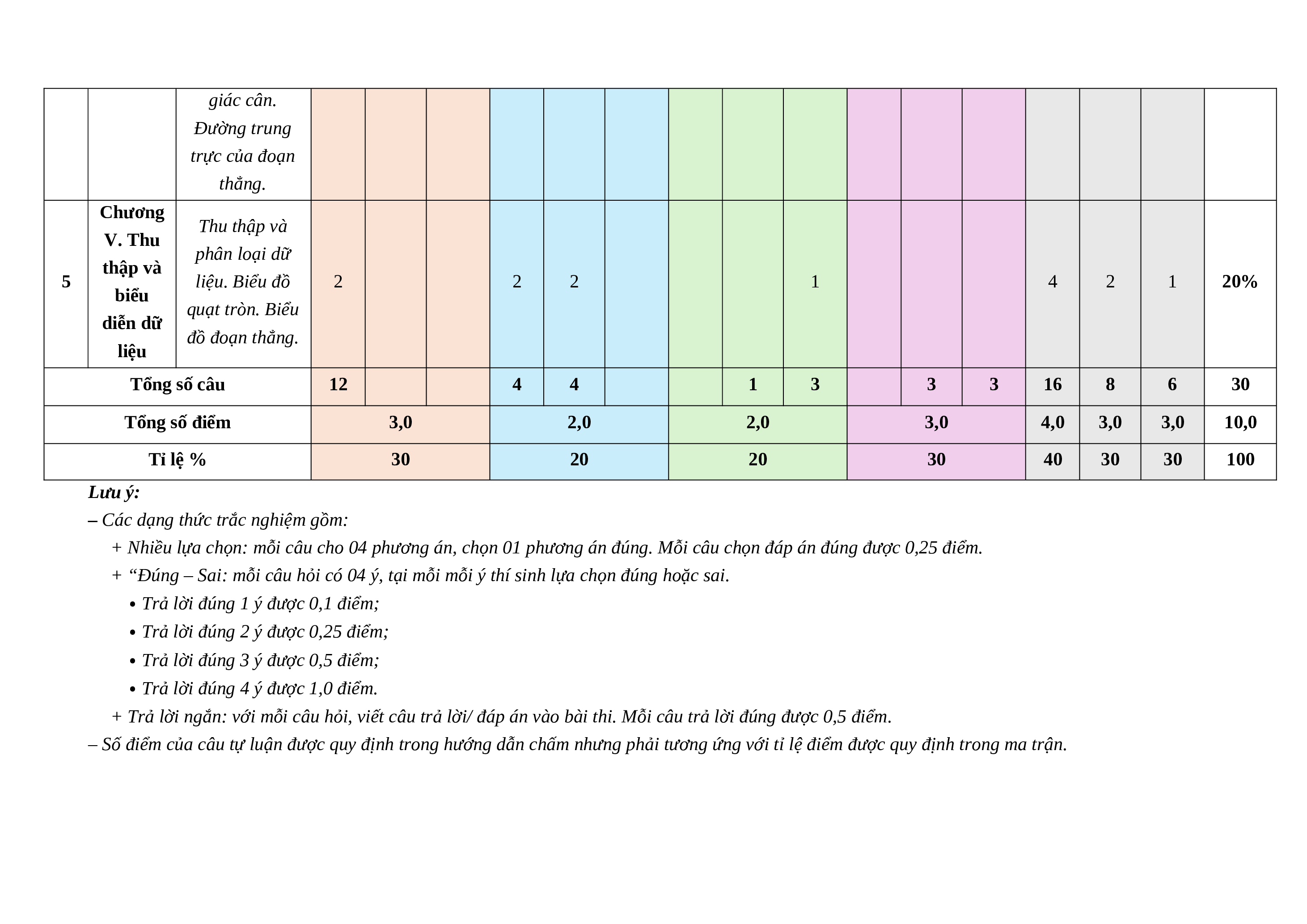 diễn dữ đồ đoạn thẳng. liệu Tổng số câu 12 4 4 1 3 3 3 16 8 6 30 Tổng số điểm 3,0 2,0 2,0 3,0 4,0 3,0 3,0 10,0 Tỉ lệ % 30 20 20 30 40 30 30 100 Lưu ý: