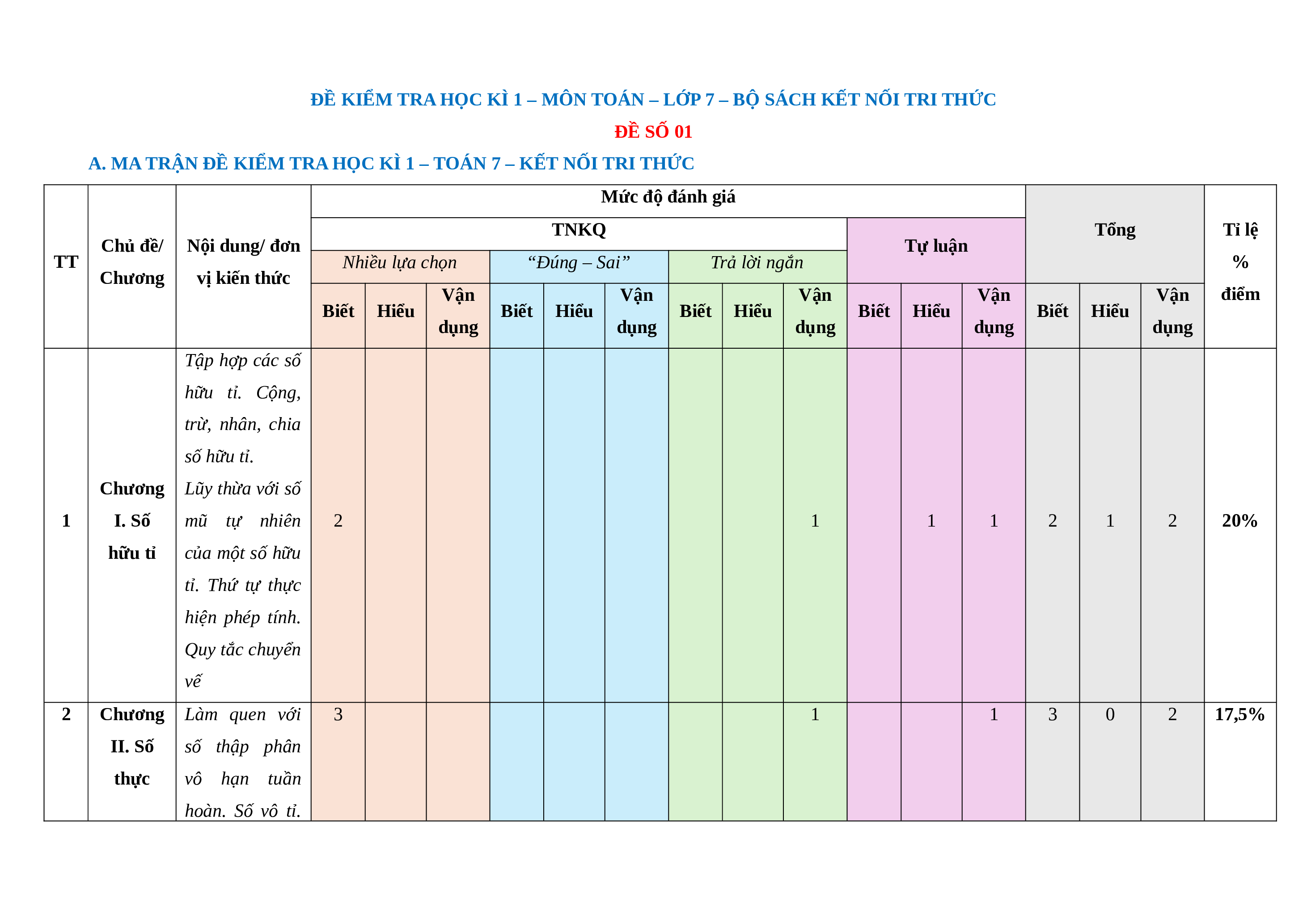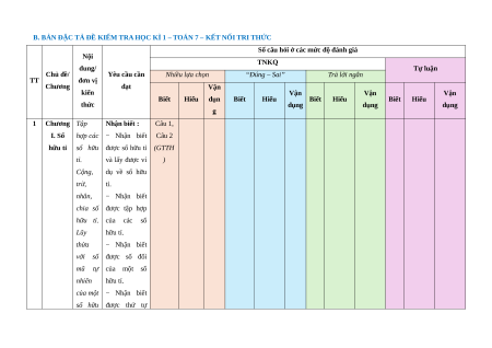 Chủ đề/ Nội dung/ đơn Tự luận TT Nhiều lựa chọn “Đúng – Sai” Trả lời ngắn % Chương vị kiến thức Vận Vận Vận Vận Vận điểm Biết Hiểu Biết Hiểu Biết Hiểu Biết Hiểu Biết Hiểu dụng dụng dụng dụng dụng Tập hợp các số hữu tỉ. Cộng, trừ, nhân, chia số hữu tỉ.