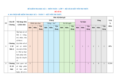 A. MA TRẬN ĐỀ KIỂM TRA HỌC KÌ 1 – TOÁN 7 – KẾT NỐI TRI THỨC Mức độ đánh giá TNKQ Tổng Tỉ lệ