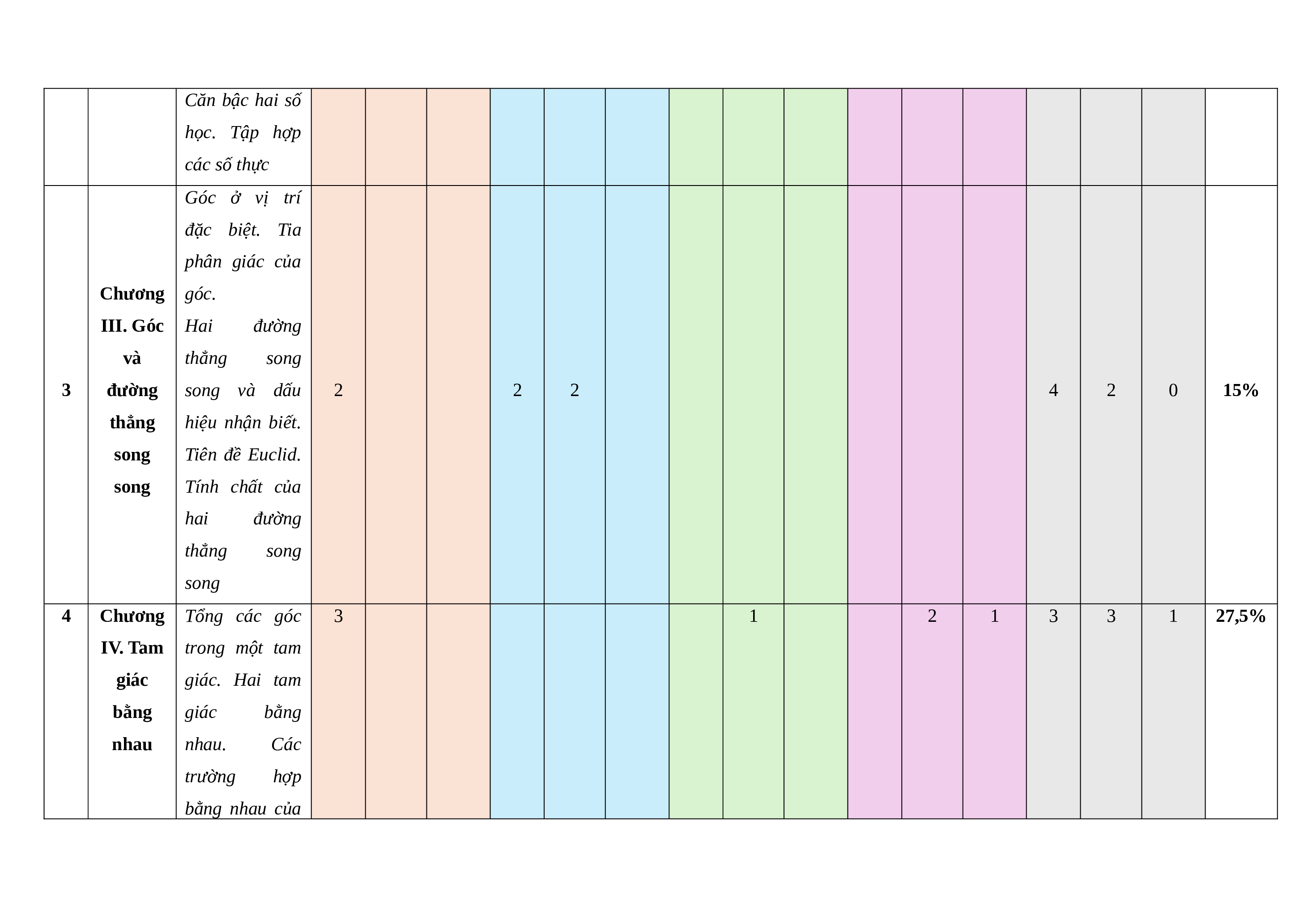 III. Góc Hai đường và thẳng song 3 đường song và dấu 2 2 2 4 2 0 15% thẳng hiệu nhận biết. song Tiên đề Euclid. song Tính chất của hai đường thẳng song song 4