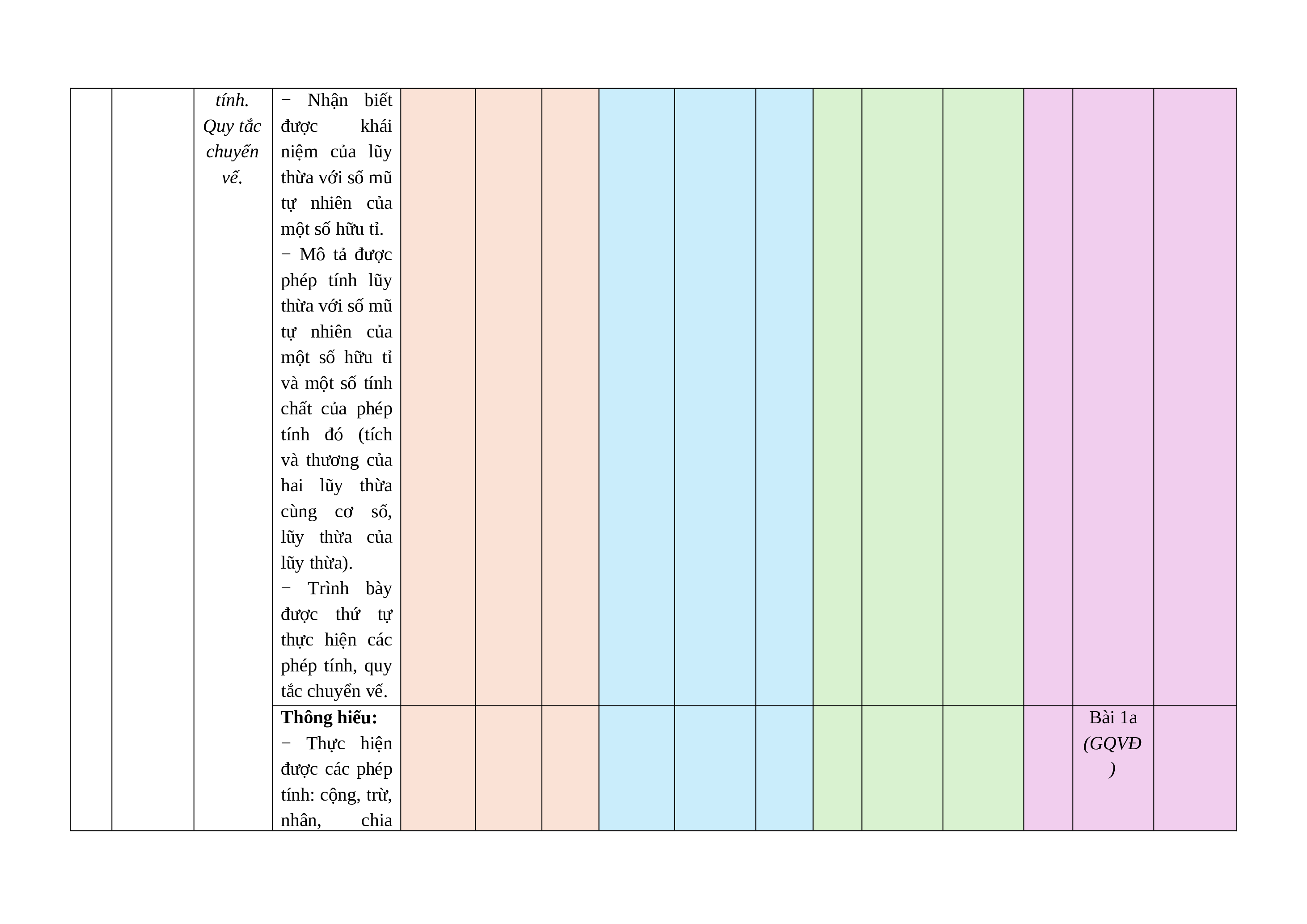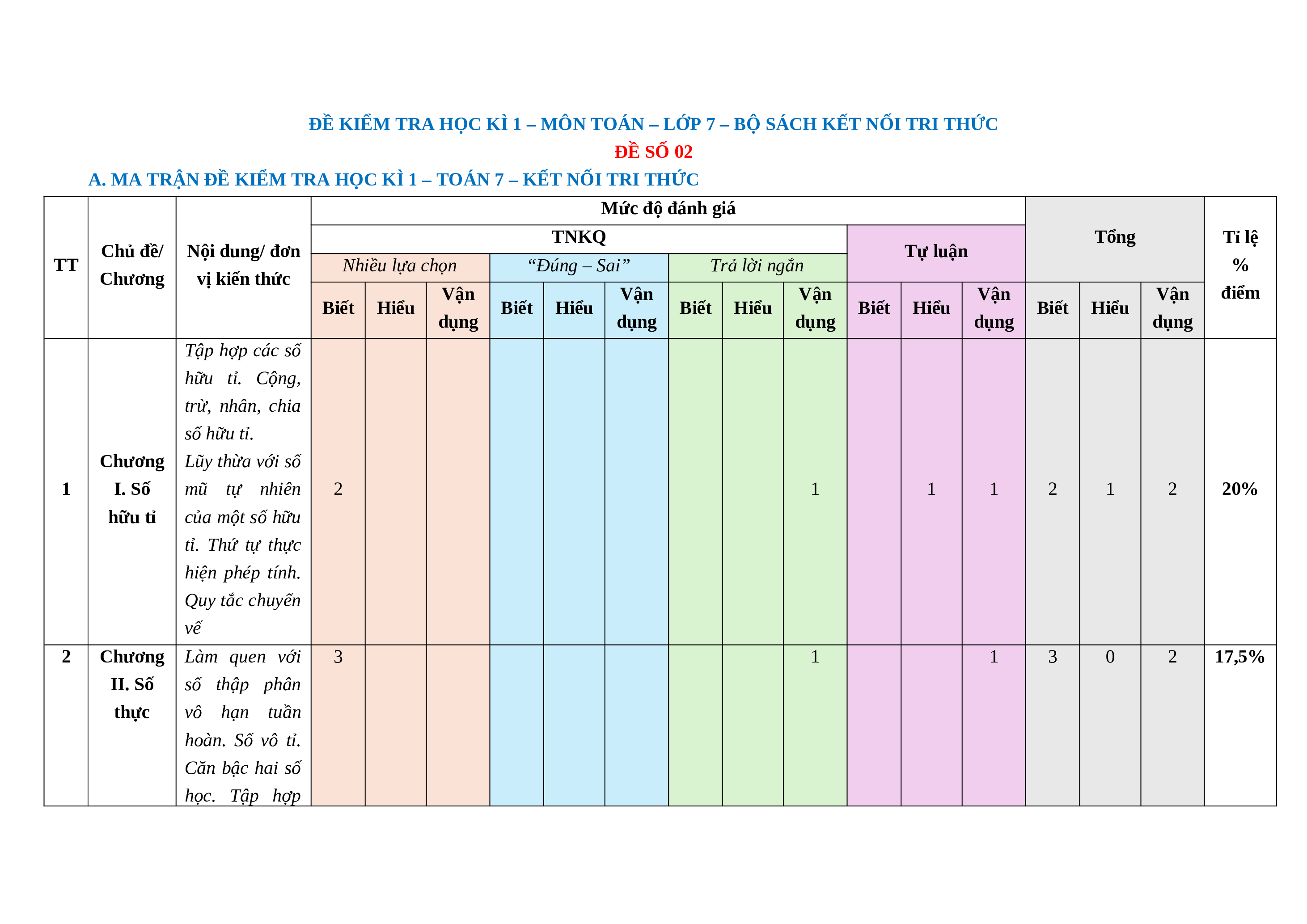 Chủ đề/ Nội dung/ đơn Tự luận TT Nhiều lựa chọn “Đúng – Sai” Trả lời ngắn % Chương vị kiến thức Vận Vận Vận Vận Vận điểm Biết Hiểu Biết Hiểu Biết Hiểu Biết Hiểu Biết Hiểu dụng dụng dụng dụng dụng Tập hợp các số hữu tỉ. Cộng, trừ, nhân, chia số hữu tỉ.
