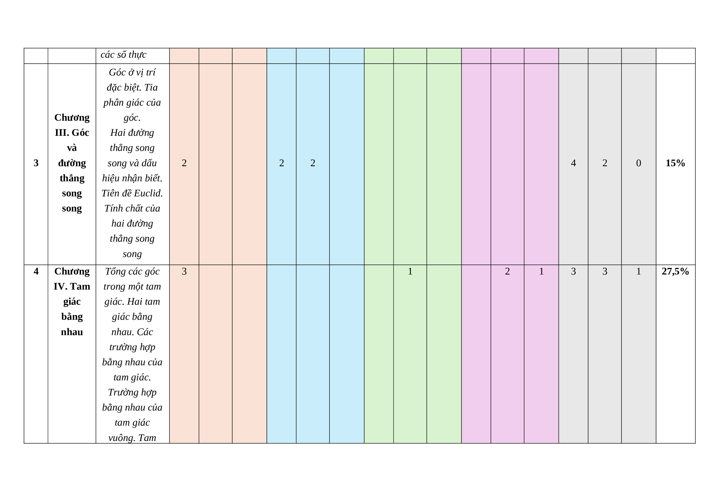 Chương Làm quen với 3 1 1 3 0 2 17,5% II. Số số thập phân thực vô hạn tuần hoàn. Số vô tỉ. Căn bậc hai số học. Tập hợp các số thực Góc ở vị trí đặc biệt. Tia phân giác của Chương góc. III. Góc Hai đường và thẳng song 3 đường song và dấu 2 2 2 4 2 0 15% thẳng hiệu nhận biết. song Tiên đề Euclid. song Tính chất của hai đường thẳng song song 4 Chương Tổng các góc 3 1 2 1 3 3 1 27,5%