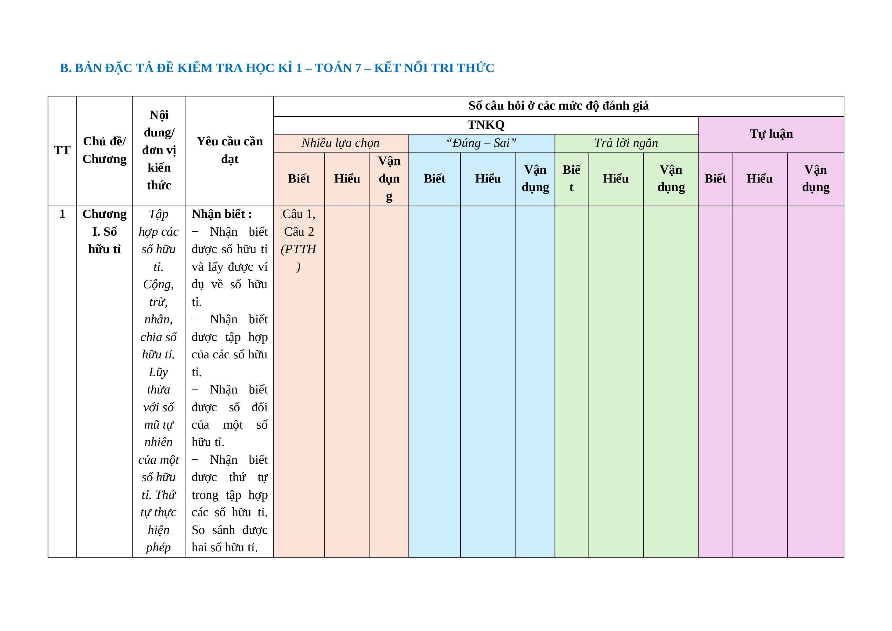 B. BẢN ĐẶC TẢ ĐỀ KIỂM TRA HỌC KÌ 1 – TOÁN 7 – KẾT NỐI TRI THỨC
