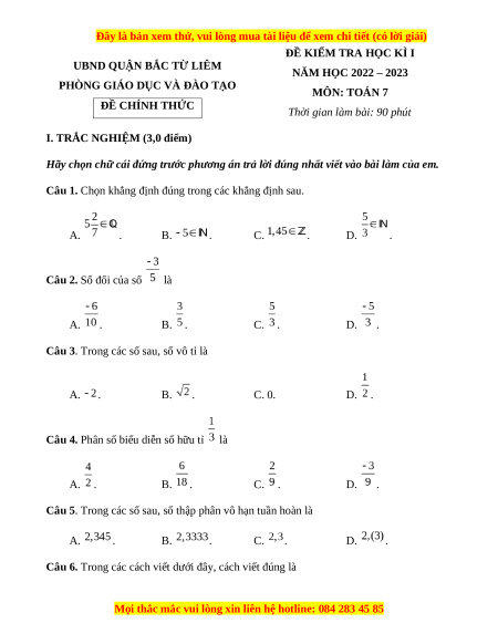 Đề thi cuối kì 1 Toán 7 Kết nối tri thức quận Bắc Từ Liêm - Hà Nội