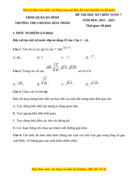 ĐỀ THI HỌC KÌ I MÔN TOÁN 7 UBND QUẬN BA ĐÌNH
