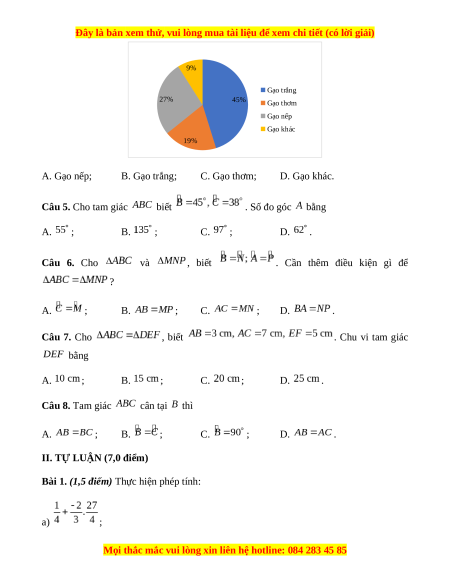 9% Gạo trắng 27% 45% Gạo thơm Gạo nếp Gạo khác 19% A. Gạo nếp; B. Gạo trắng; C. Gạo thơm; D. Gạo khác. Câu 5. Cho tam giác biết . Số đo góc bằng A. ; B. ; C. ; D. . Câu 6. Cho và , biết