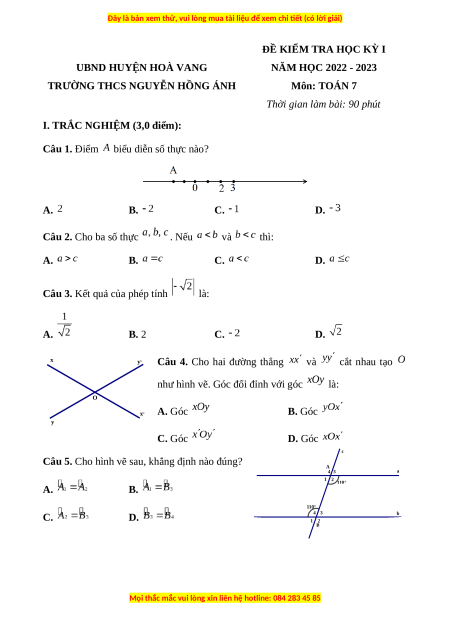 ĐỀ KIỂM TRA HỌC KỲ I UBND HUYỆN HOÀ VANG NĂM HỌC 2022 - 2023