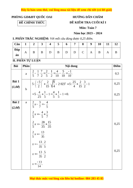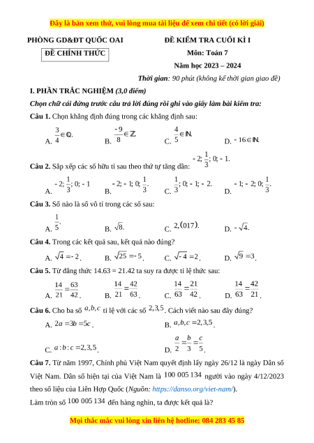 Đề thi cuối kì 1 Toán 7 Phòng GD&ĐT Quốc Oai Hà Nội