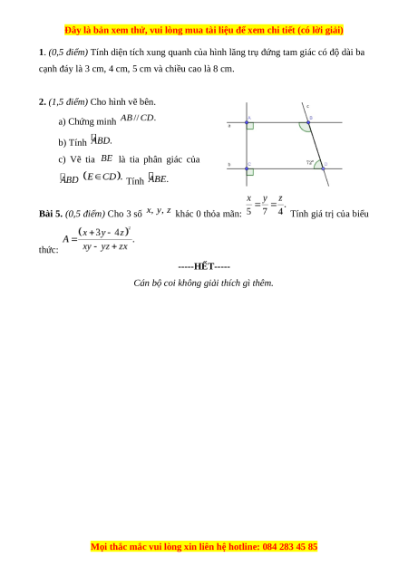 1. (0,5 điểm) Tính diện tích xung quanh của hình lăng trụ đứng tam giác có độ dài ba