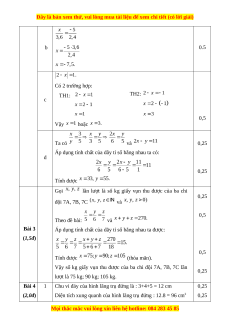I. PHẦN TRẮC NGHIỆM: Với mỗi câu đúng được 0,25 điểm. Câu 1 2 3 4 5 6 7 8 9 10 11 12 Đáp A B B D B D D C A B A B án II. PHẦN TỰ LUẬN Bài Phần Nội dung Điểm a 0,5 Bài 1 0,25 (1,0đ) b 0,25 Bài 2 a (2,0đ) 0,25 0,25