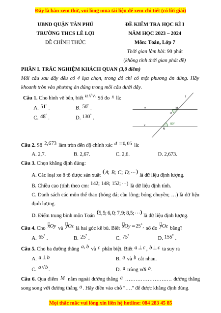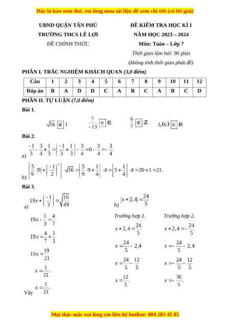 Đề thi cuối kì 1 Toán 7 trường THCS Lê Lợi TP Hồ Chí Minh