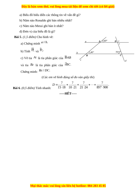 Bài 5. (1,5 điểm) Cho hình vẽ: a A 1 40° D 2 a) Chứng minh 1 b) Tính và b 1 40° 70° B C c) Vẽ tia là tia phân giác của c d và tia là tia phân giác của Chứng minh: