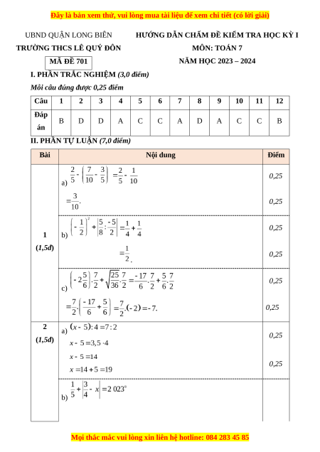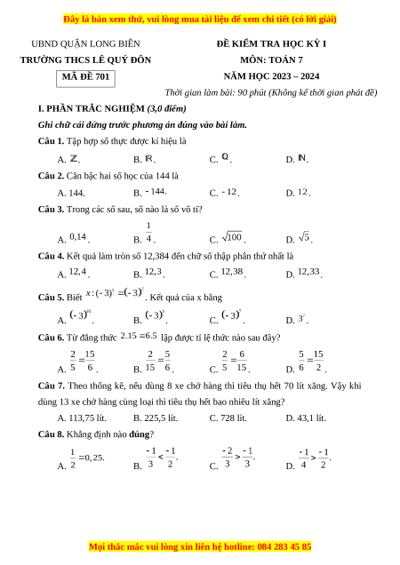 TRƯỜNG THCS LÊ QUÝ ĐÔN MÔN: TOÁN 7 MÃ ĐỀ 701