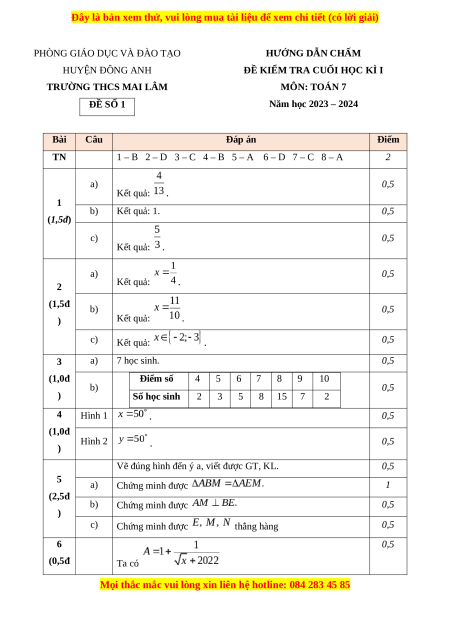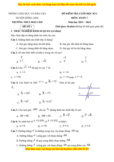 ĐỀ KIỂM TRA CUỐI HỌC KÌ I HUYỆN ĐÔNG ANH MÔN: TOÁN 7 TRƯỜNG THCS MAI LÂM