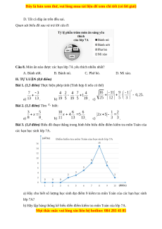 1 – B 2 – D 3 – C 4 – B 5 – A 6 – D 7 – C 8 – A 2 a) 0,5 Kết quả: . 1 b) Kết quả: 1. 0,5 (1,5đ) c) 0,5 Kết quả: . a) 0,5 2 Kết quả: . (1,5đ b) 0,5 ) Kết quả: . c) Kết quả: . 0,5 3 a) 7 học sinh. 0,5 (1,0đ Điểm số 4 5 6 7 8 9 10 b) 0,5 ) Số học sinh 2 3 5 8 15 7 2 4 Hình 1 . 0,5 (1,0đ Hình 2 ) . 0,5