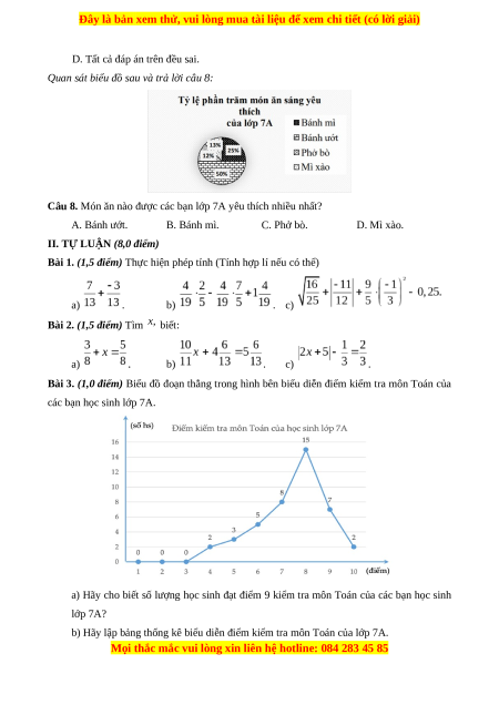 Câu 8. Món ăn nào được các bạn lớp 7A yêu thích nhiều nhất? A. Bánh ướt. B. Bánh mì. C. Phở bò. D. Mì xào.