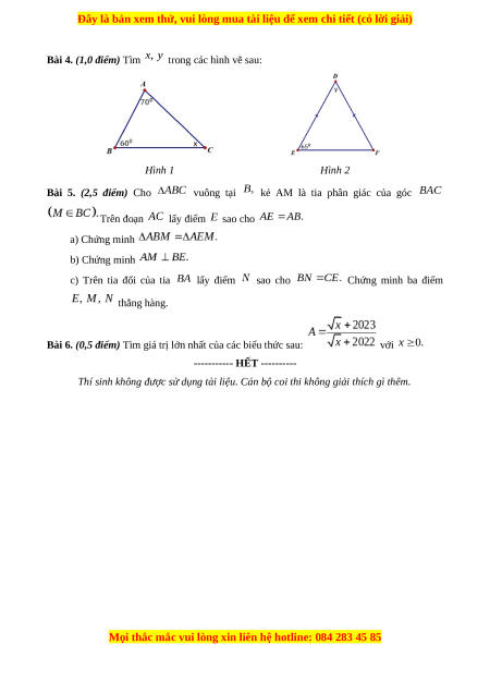 Câu 4. Cho hình vẽ, biết và Tính số đo góc A. B. C. . D. Câu 5. Cho tam giác cân tại