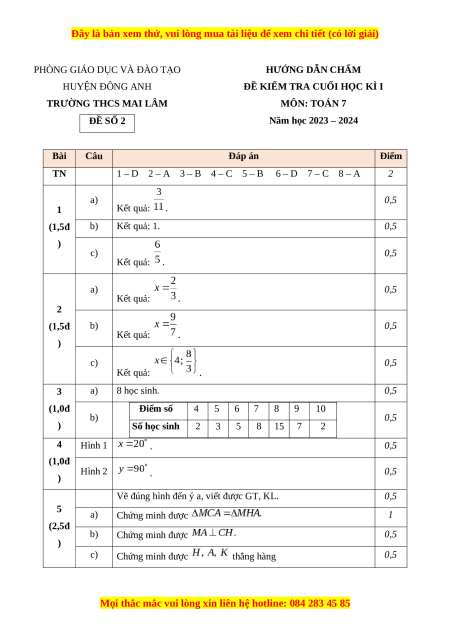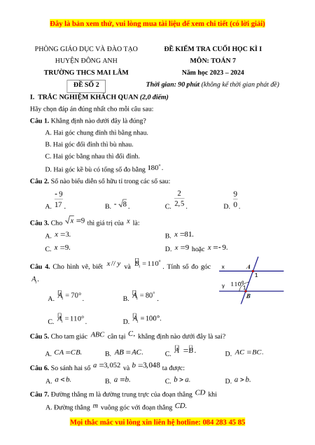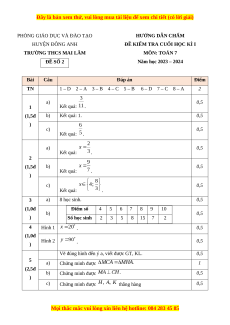 ĐỀ KIỂM TRA CUỐI HỌC KÌ I HUYỆN ĐÔNG ANH MÔN: TOÁN 7 TRƯỜNG THCS MAI LÂM