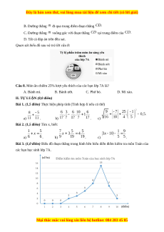 1 – D 2 – A 3 – B 4 – C 5 – B 6 – D 7 – C 8 – A 2 a) 0,5 1 Kết quả: . (1,5đ b) Kết quả: 1. 0,5 ) c) 0,5 Kết quả: . a) 0,5 Kết quả: . 2 (1,5đ b) 0,5 Kết quả: . ) c) 0,5 Kết quả: . 3 a) 8 học sinh. 0,5 (1,0đ Điểm số 4 5 6 7 8 9 10 b) 0,5 ) Số học sinh 2 3 5 8 15 7 2 4 Hình 1 . 0,5 (1,0đ Hình 2 ) . 0,5