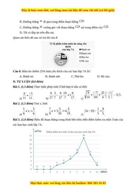 Câu 8. Món ăn chiếm 25% lượt yêu thích của các bạn lớp 7A là? A. Bánh mì. B. Bánh ướt. C. Phở bò. D. Mì xào.