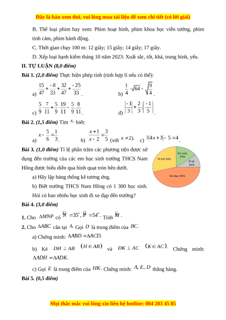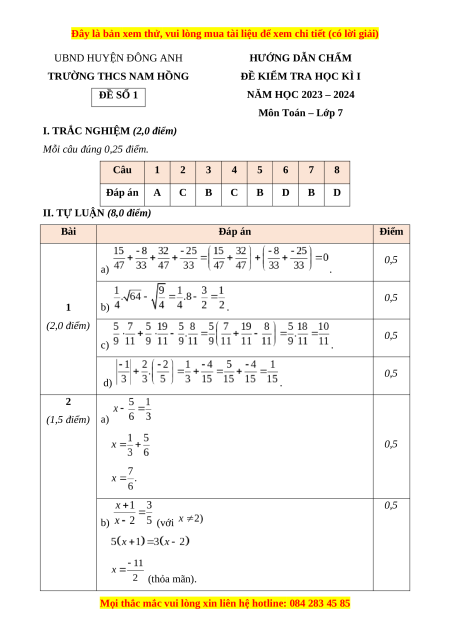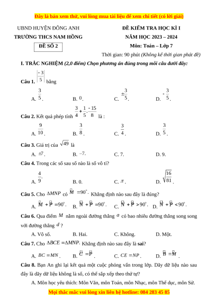 Đề thi cuối kì 1 Toán 7 trường THCS Nam Hồng Hà Nội - Đề số 2