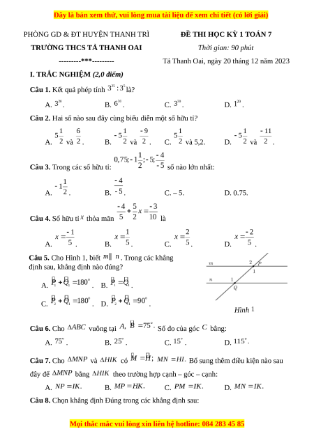 Đề thi cuối kì 1 Toán 7 trường THCS Tả Thanh Oai Hà Nội
