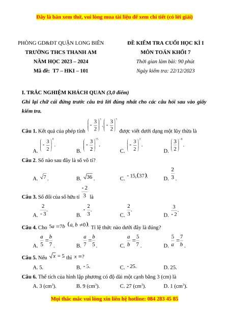 NĂM HỌC 2023 – 2024 MÔN TOÁN KHỐI 7 Mã đề: T7-HKI-101