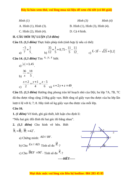 2. (1,5 điểm) Cho hình vẽ bên. Biết 1 D A 1 H x a) Chứng minh: 1 E 2 b) Cho Tính số đo ? 1 1 B F c) Cho Tính số đo ? -----HẾT-----