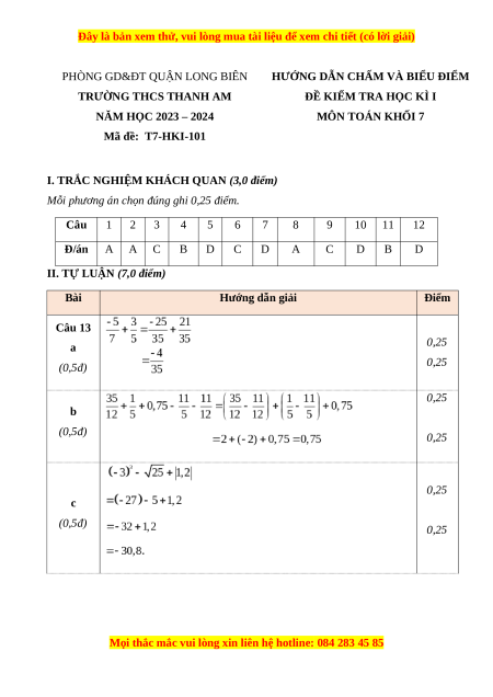 Đề thi cuối kì 1 Toán 7 trường THCS Thanh Am Hà Nội