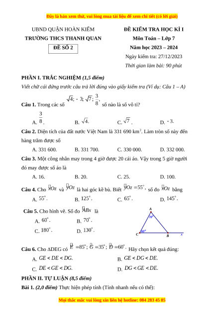 TRƯỜNG THCS THANH QUAN Môn Toán – Lớp 7 ĐỀ SỐ 2