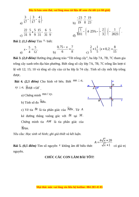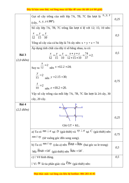 Bài 3. (2,0 điểm) Hưởng ứng phong trào “Tết trồng cây”, ba lớp 7A, 7B, 7C tham gia