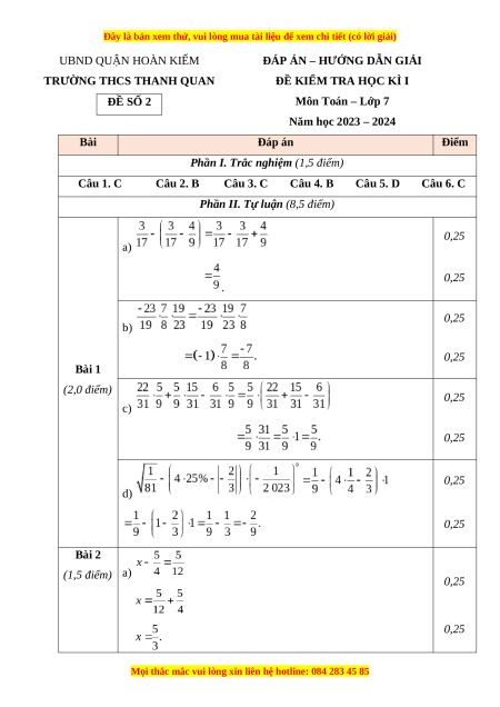 Phần II. Tự luận (8,5 điểm) 0,25 a) 0,25 . 0,25 b) 0,25 Bài 1 (2,0 điểm) 0,25 c) 0,25 0,25 d) 0,25 Bài 2 (1,5 điểm) a) 0,25 0,25