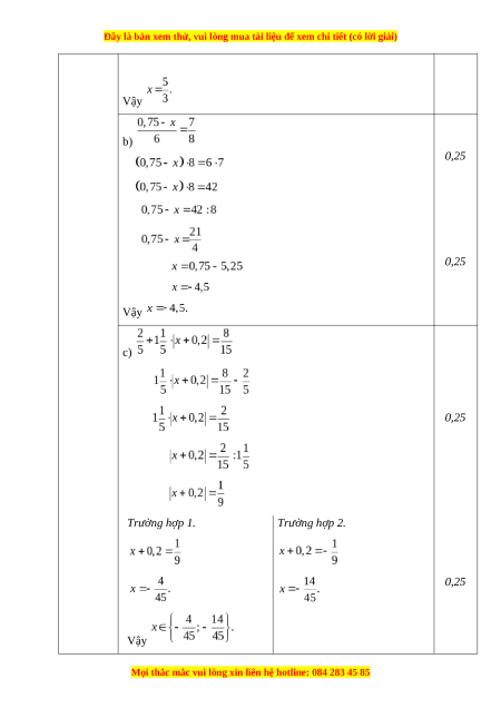 Vậy b) 0,25 0,25 Vậy c) 0,25 Trường hợp 1. Trường hợp 2. 0,25 Vậy
