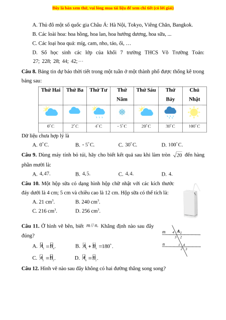 Câu 8. Bảng tin dự báo thời tiết trong một tuần ở một thành phố được thống kê trong bảng sau: Thứ Hai Thứ Ba Thứ Tư Thứ Thứ Sáu Thứ Chủ Năm Bảy Nhật