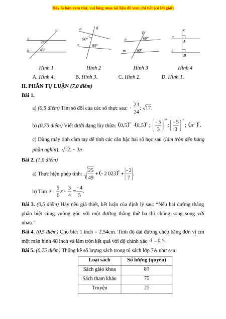Bài 5. (0,75 điểm) Thống kê số lượng sách trong tủ sách lớp 7A như sau: Loại sách Số lượng (quyển) Sách giáo khoa Sách tham khảo Truyện