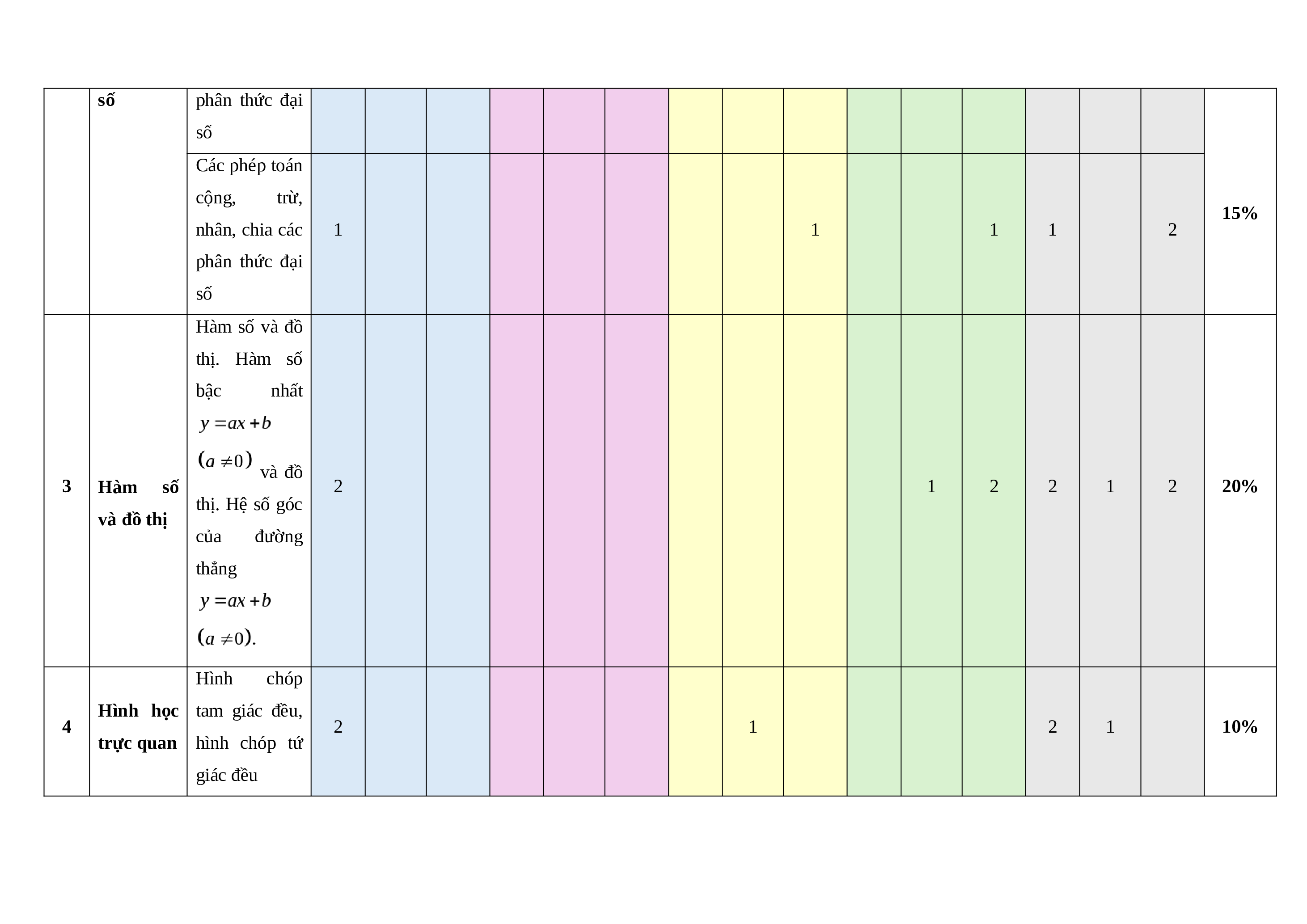 thức đại số. Tính chất  cơ bản của  số phân thức đại  số Các phép toán  cộng, trừ,  15% nhân, chia các  1 1 1 1 2 phân thức đại  số  Hàm số và đồ  thị. Hàm số  bậc   nhất   và đồ  3 Hàm số  2 1 2 2 1 2 20% thị. Hệ số góc  và đồ thị của đường  thẳng  Hình chóp