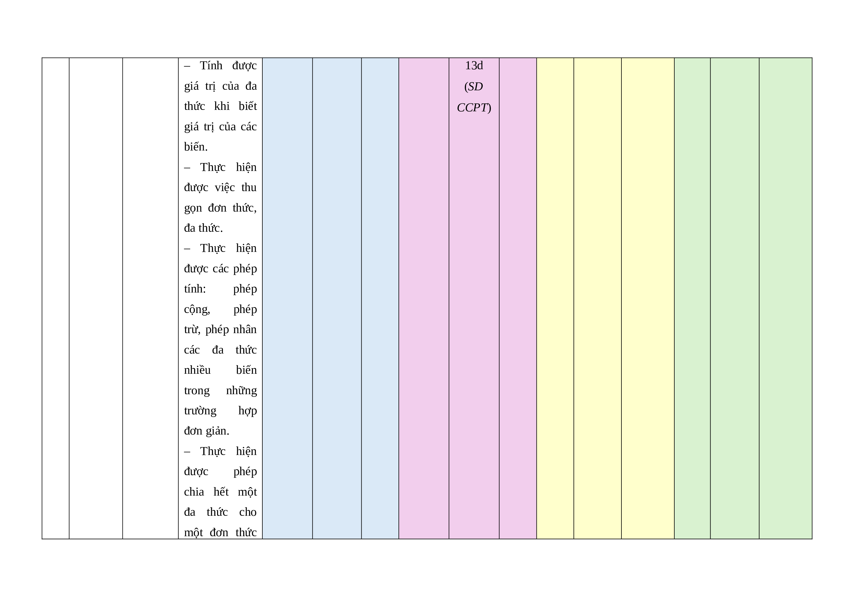 Đa thức Đa thức Biết: Câu 1,  Câu  nhiều  nhiều  – Nhận biết Câu 2  13a,  biến biến.  được  đơn (GTTH) 13b,  Các  thức, đa thức  13c  phép  nhiều biến,  (GTTH) toán  đơn thức và đa  cộng,  thức thu gọn.  trừ,  – Nhận biết hệ  nhân,  số, phần biến,  chia các bậc của đơn  đa thức thức và bậc  nhiều  của đa thức. biến – Nhận biết  các đơn thức  đồng dạng. Hiểu: Câu
