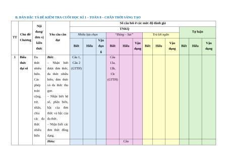 Số câu hỏi ở các mức độ đánh giá Nội TNKQ dung/ Tự luận Chủ đề/ Yêu cầu cần Nhiều lựa chọn “Đúng – Sai” Trả lời ngắn TT đơn vị Chương đạt Vận kiến Vận Vận Vận Biết Hiểu dụn Biết Hiểu Biết Hiểu Biết Hiểu thức dụng dụng dụng g 1 Biểu Đa Biết: Câu 1, Câu thức thức – Nhận biết Câu 2 13a, đại số nhiều