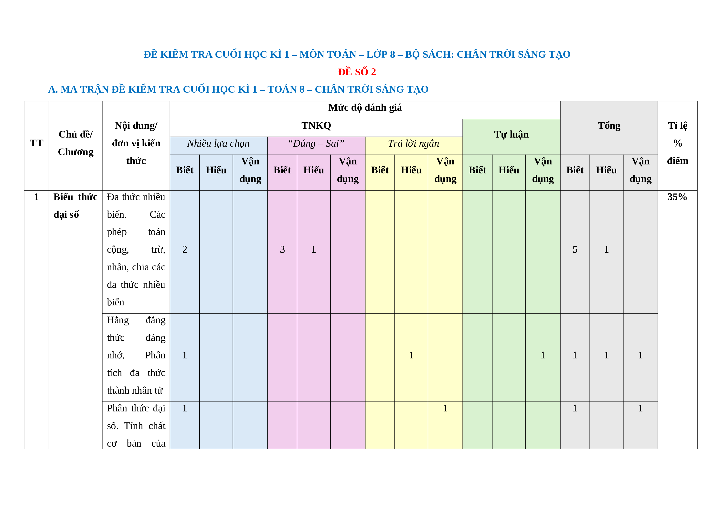 A. MA TRẬN ĐỀ KIỂM TRA CUỐI HỌC KÌ 1 – TOÁN 8 – CHÂN TRỜI SÁNG TẠO Mức độ đánh giá Nội dung/ TNKQ Tổng Tỉ lệ Chủ đề/ Tự luận TT đơn vị kiến Nhiều lựa chọn “Đúng – Sai” Trả lời ngắn % Chương thức Vận Vận Vận Vận Vận điểm Biết Hiểu Biết Hiểu Biết Hiểu Biết Hiểu Biết Hiểu dụng dụng dụng dụng dụng 1