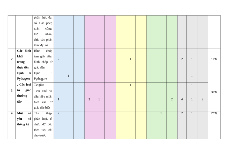 Biểu thức Đa thức nhiều 35% đại số biến. Các phép toán cộng, trừ, 2 3 1 5 1 nhân, chia các đa thức nhiều biến Hằng đẳng thức đáng nhớ. Phân 1 1 1 1 1 1 tích đa thức thành nhân tử Phân thức đại 1 1 1 1 số. Tính chất cơ bản của phân thức đại số. Các phép toán cộng, trừ, nhân, chia các phân thức đại số Các hình Hình chóp khối tam giác đều, 2 2 1 2 1 10% trong hình chóp tứ thực tiễn giác đều Định lí Định lí 1 1 Pythagore Pythagore