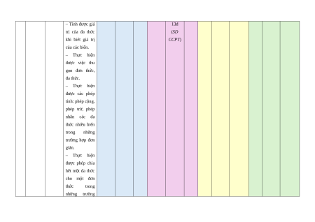 được đơn thức, (GTTH) 13b, biến. đa thức nhiều 13c Các biến, đơn thức (GTTH) phép và đa thức thu toán gọn. cộng, – Nhận biết hệ trừ, số, phần biến, nhân, bậc của đơn chia thức và bậc của các đa đa thức. thức – Nhận biết các nhiều đơn thức đồng biến dạng. Hiểu: Câu