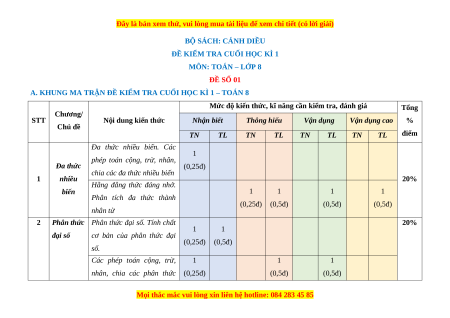 - Tailieugiaovien.com.vn giới thiệu bộ đề cuối kì 1 gồm đầy đủ ma trận và lời giải chi tiết môn Toán 8 Cánh diều mới nhất năm 2024 nhằm giúp Giáo viên có thêm tài liệu tham khảo ra đề thi Toán lớp 8.