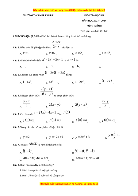 KIỂM TRA HỌC KÌ I NĂM HỌC 2023 – 2024 MÔN: TOÁN 8