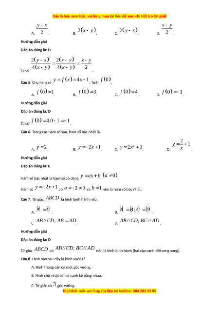 nên là hàm số bậc nhất. Câu 7. Tứ giác là hình bình hành nếu: A. . B. . C. . D. . Hướng dẫn giải Đáp án đúng là: D Tứ giác có